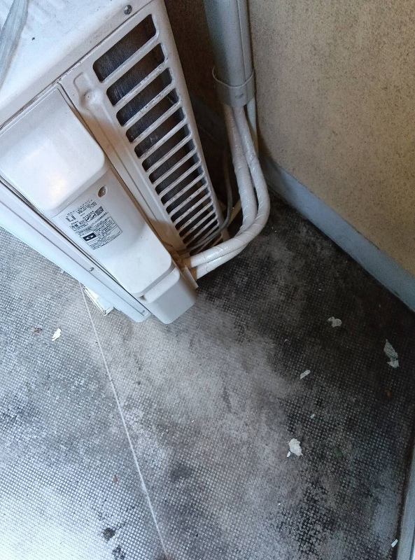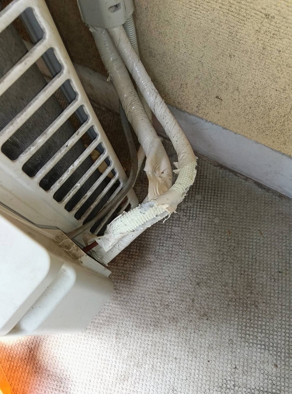 室外機まわりにフンと損傷。すでに侵入の形跡あり