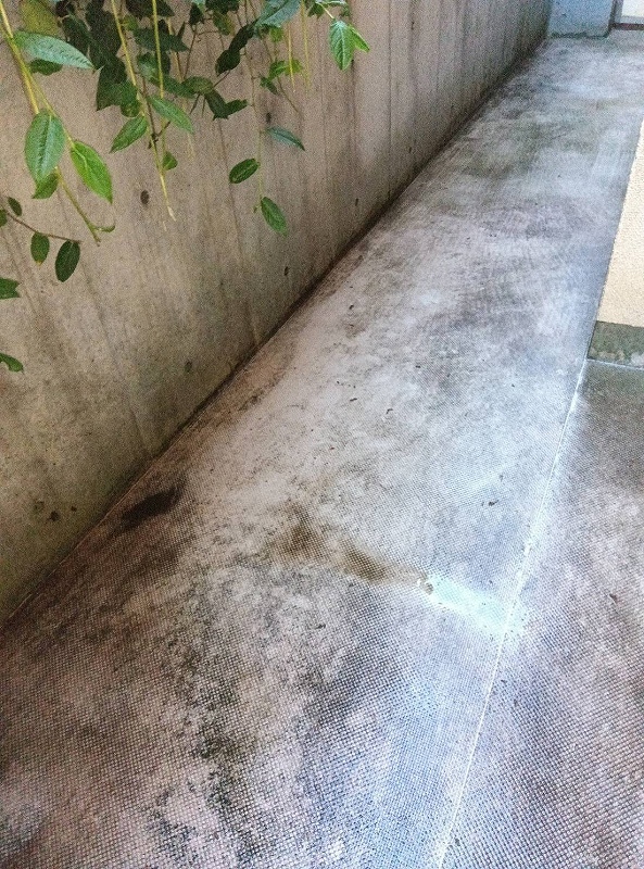 ところが、わずかに目を離した隙に、タヌキが2mほどの仕切り板を駆け上がって逃走。バルコニーにはごみも散乱し、フンで不衛生な状況でしたので、清掃も併せて行いました。